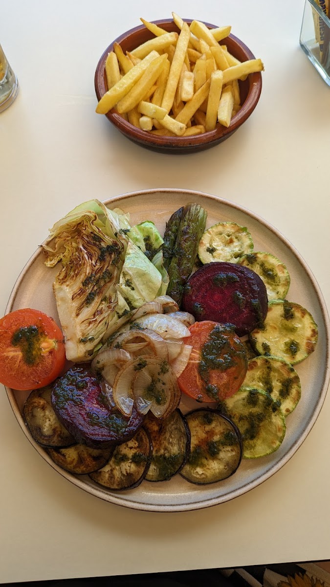 Here, the menu mirrors this approach. It isn’t about flashy reinvention, but rather about honest, thoughtfully prepared food that speaks of place and season. From a perfectly brewed cappuccino paired with a flaky croissant sandwich to the satisfying mix of smoky, grilled vegetables and rustic potatoes, each dish feels like a small celebration of simple pleasures. Cocktails and glasses of Tinto de Verano add a bright, uplifting note, perfect for afternoons that stretch lazily into evening.